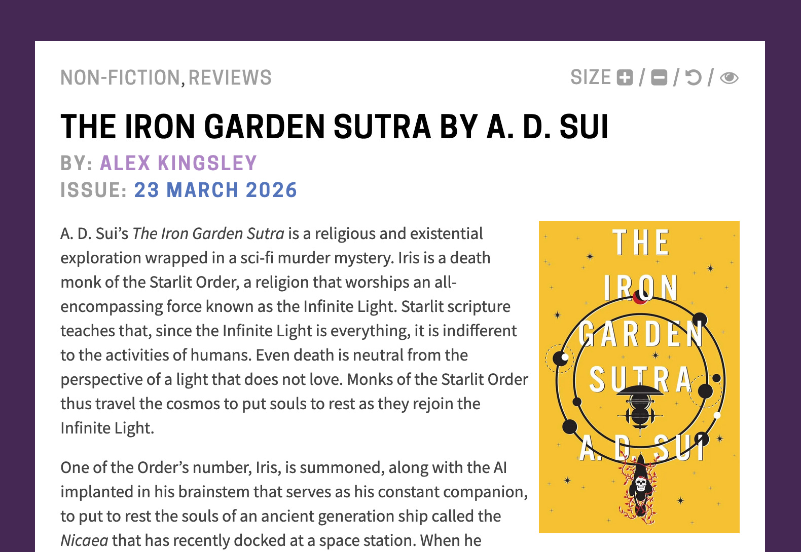 I’ve got a new review out in Strange Horizons! Under review is A.D. Sui’s Iron Garden Sutra.